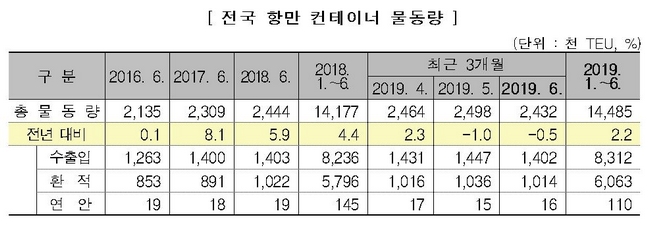 해양수산부에 따르면 올해 상반기 수출입물동량은 전년 동기 대비 0.9% 증가한 831만2000TEU, 환적물동량은 부산 인천 광양항이 모두 증가하며 전년 동기 대비 4.6% 증가한 606만3000TEU로 나타났다. 4월 2.3%의 플러스성장을 끝으로 5월 -1% 6월 -0.5% 등 내리 역신장하며 성장률을 갉아먹었다.