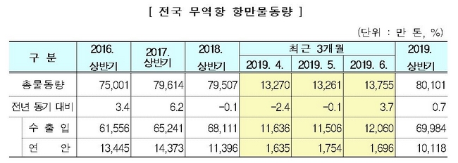 전국 무역항이 처리한 항만물동량은 톤수 기준 8억101만t으로 전년 동기 대비 0.7% 증가했다. 부산항과 광양항이 전년 동기 대비 각각 4.3% 4.4% 증가했으나, 인천항과 평택·당진항은 각각 5.7% 3.3% 감소했다.