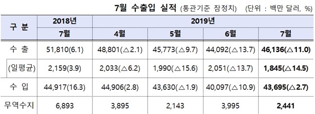 미중 무역분쟁 장기화와 일본 수출 규제 등 대외 여건 악화, 반도체 업황부진 및 단가하락, 국제유가 회복 지연 등이 복합적으로 작용한 게 수출 부진 요인으로 작용했다. 다만 일본 수출 규제가 7월 수출에 미치는 영향은 제한적으로 보인다고 산자부 측은 밝혔다.