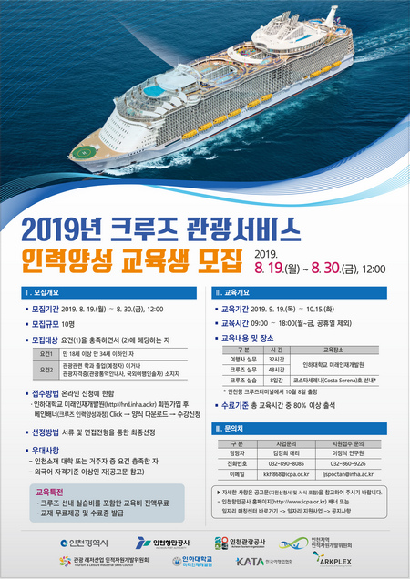 인천항만공사(IPA)는 인천지역 크루즈 산업 활성화 및 크루즈 전문가 양성을 위해 여행사 등 관광관련 산업에 취업을 희망하는 취업준비생을 대상으로 ‘2019 크루즈 관광서비스 인력양성’ 사업을 추진하고 교육생 총 10명을 모집한다고 밝혔다.