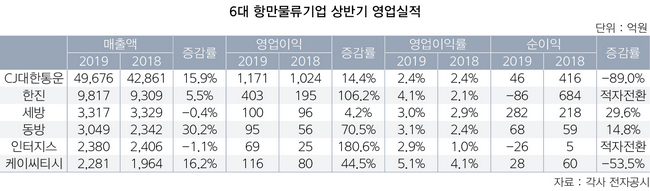 국내 주요 6개 항만물류기업의 상반기 영업실적이 크게 개선된 것으로 나타났다. 6개사는 대체로 외형성장을 거둔 데 이어 영업이익도 큰 폭으로 늘어나는 등 여느 때보다 실적성장이 두드러졌다. 하지만 순이익은 영업이익 증가 폭만큼 호조를 보여주지 못했다.