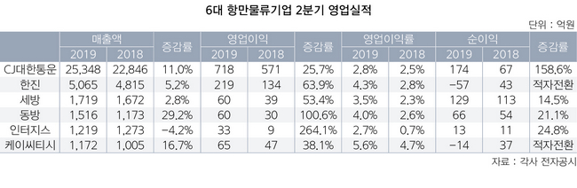 한진은 핵심사업인 택배 하역사업 외에도 해운사업이 구조개선 효과로 영업실적 향상에 크게 기여한 것으로 나타났다. 한진의 상반기 영업실적은 매출액 9817억원, 영업이익 403억원으로 각각 5.5% 106.2% 성장한 것으로 나타났다.
