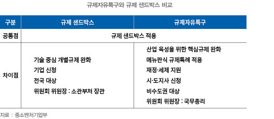 규제 샌드박스란 기존에 존재하는 규제에도 불구하고, 신기술·신산업을 시도 할 수 있도록 일정조건 하(시간·장소·규모)에서 규제를 면제·유예시켜 주는 ‘혁신의 실험장’이다. 아이들이 안전하게 마음껏 뛰어놀 수 있는 모래 놀이터(sandbox)에서 유래된 개념이다. 규제 샌드박스는 개별 기업이 신청하는 제도인데 반해, 규제자유특구는 지자체가 신청하고 재정 및 세제가 지원되는 제도다. 규제자유특구는 곧 지역단위의 규제 샌드박스인 셈이다.