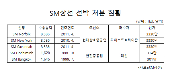 SM상선 관계자는 선박 매각에 대해 “환경 규제 이슈 등으로 잠재적인 비용 문제가 불거지고 있다”며 “비용 관리 측면에서 선대 재편을 진행하고 있다”고 말했다.