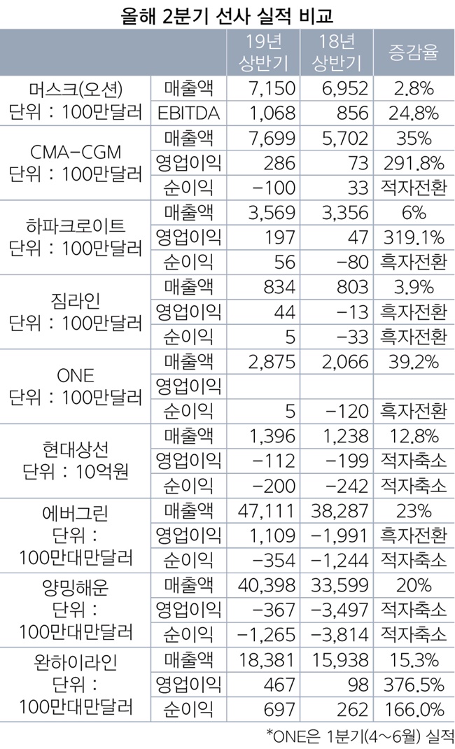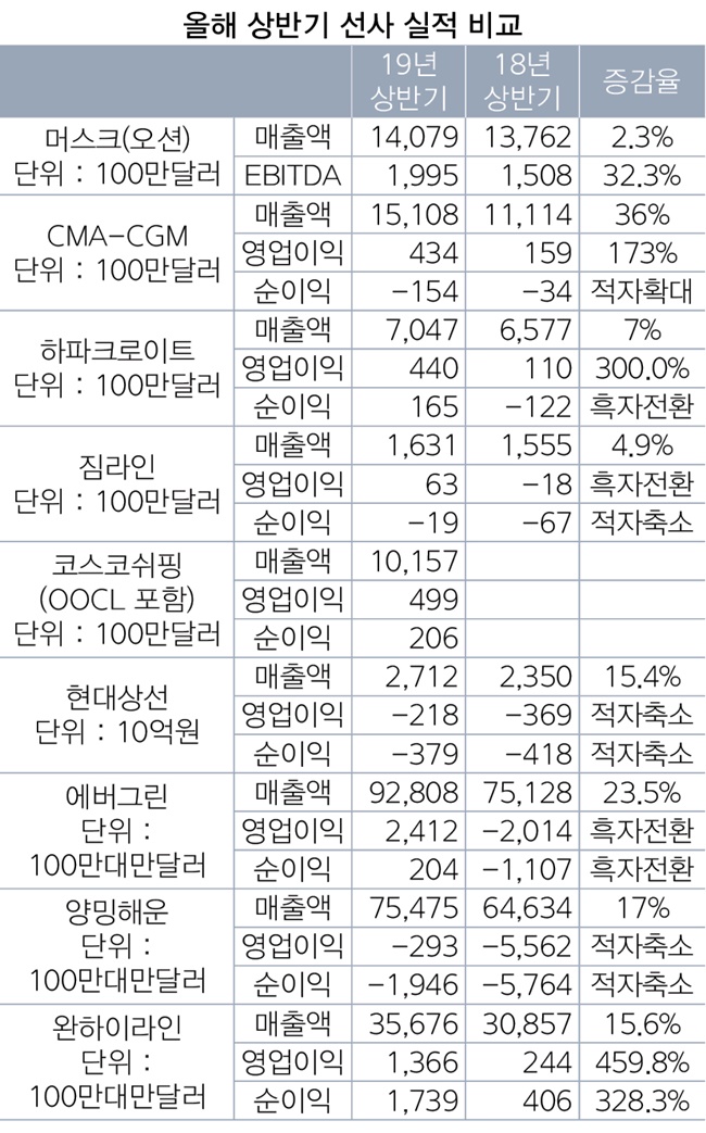 프랑스 선사인 CMA CGM도 비용 절감과 세바로지스틱스 인수 효과에 힘입어 외형과 내실을 키웠다. 상반기 영업이익은 4억3400만달러(약 5200억원)를 기록, 지난해 상반기 1억5900만달러와 비교해 3배 가까이 성장했다. 다만 순이익은 세바로지스틱스 인수 관련 비용이 반영되면서 -1억5400만달러(약 -1800억원)로 적자 폭이 확대됐다. 2분기 영업이익은 291.8% 증가한 2억8600만달러(약 3400억원)를 거뒀다. 순이익은 -1억달러(약 -1200억원)로 전년 3300만달러에서 적자 전환했다.