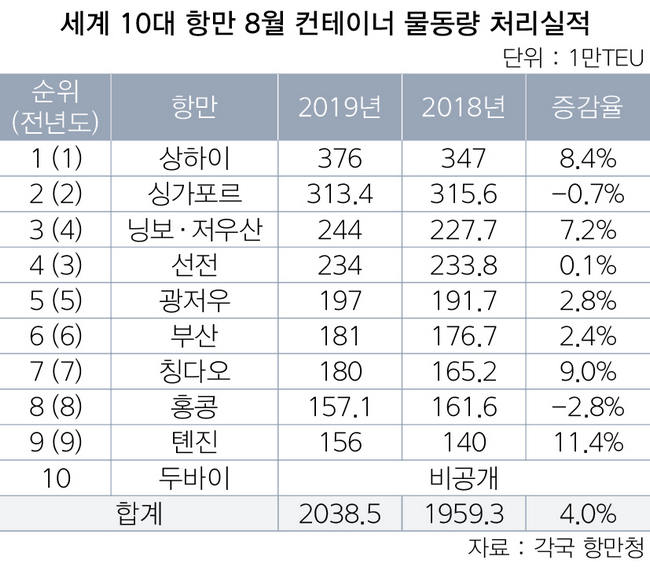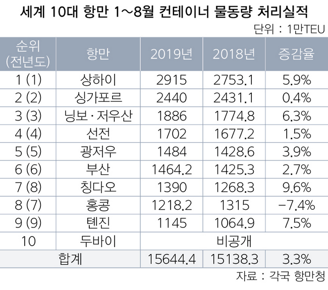 각 항만당국에 따르면 올해 1~8월 세계 10대 항만(두바이 제외)이 처리한 컨테이너 물동량은 20피트 컨테이너(TEU) 기준 지난해 같은 기간 대비 3.3% 성장한 1억5644만4000TEU로 집계됐다. 이 기간 물동량 처리실적은 상하이 싱가포르 닝보·저우산 선전 광저우 부산 칭다오 홍콩 톈진 순으로 이어졌다.