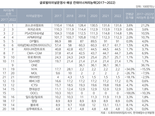 올해 9위는 일본 정기선 3사 통합법인인 오션네트워크익스프레스(ONE)가 차지했다. ONE은 3610만TEU의 처리능력을 확보해 올해 9위에 랭크됐다. 뒤이어 독일계 GTO인 유로게이트가 2490만TEU의 하역능력을 갖춰 10위에 이름을 올렸다.
