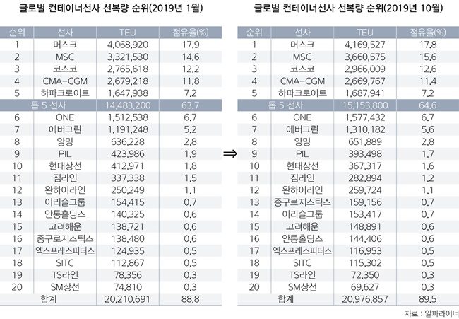 20대 컨테이너선사들의 해운시장 점유율이 열 달 새 상승했다. 프랑스 해운조사기관인 알파라이너에 따르면 10월16일 현재 20대 컨테이너선사들의 보유 선복량은 2097만6900TEU로 집계됐다. 이는 연초 2021만700TEU 대비 3.8% 증가한 수치다. 점유율 역시 88.8%에서 89.5%로 0.6%포인트(p) 상승하며 90%대 진입을 목전에 두고 있다.