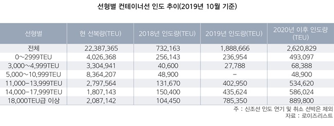 다만 신조 발주는 예년에 비해 감소하고 있다. 최근 에버그린이 2만3000TEU급 12척을 발주하는 등 올해 발주량은 약 52만TEU를 기록했지만 2018년 137만TEU의 40% 수준이다.
