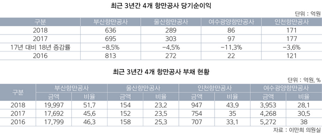 그 외 IPA의 지난해 순이익은 3.6% 감소한 171억원, 부채액은 947억원을 기록했다. YGPA는 순이익이 11.3% 줄어든 86억원, 부채액은 3953억원으로 집계됐다. UPA는 4대 항만공사 중 유일하게 순이익 289억원, 부채 154억원을 기록해 재정이 건전한 것으로 나타났다.
