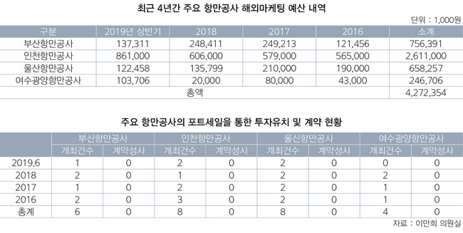 항만공사별 해외마케팅 현황을 살펴보면 가장 많은 예산을 투입한 곳은 IPA였다. IPA는 8회에 걸친 해외마케팅에 26억1100만원의 예산을 투입했지만 가시적인 성과를 거두진 못했다. 뒤이어 BPA가 6회의 해외마케팅을 실시하기 위해 7억5600만원을 투입한 것으로 나타났다. UPA는 8회에 달하는 세일즈 활동을 벌이기 위해 6억5800만원의 예산을 집행했다. YGPA도 4회의 마케팅 활동에 나서기 위해 2억4700만원을 투입했지만 실질적인 성과는 없었다.
