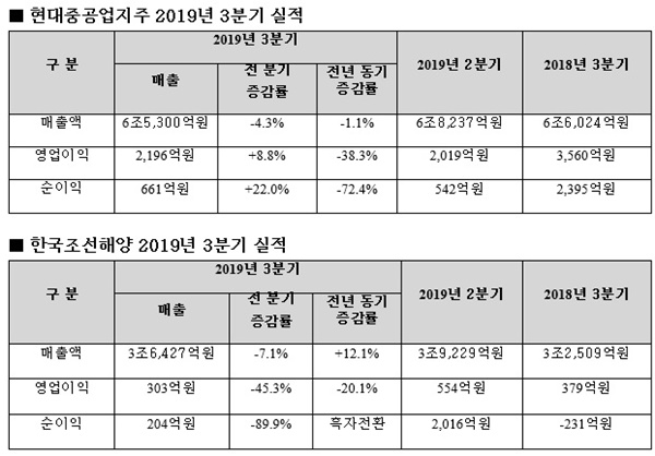 현대중공업 측은 정유부문 매출 감소와 국내외 전력시장 위축에 따른 현대일렉트릭의 부진 및 글로벌 경기 침체로 현대건설기계의 판매량이 감소한 게 매출액 후퇴로 이어졌다고 밝혔다.