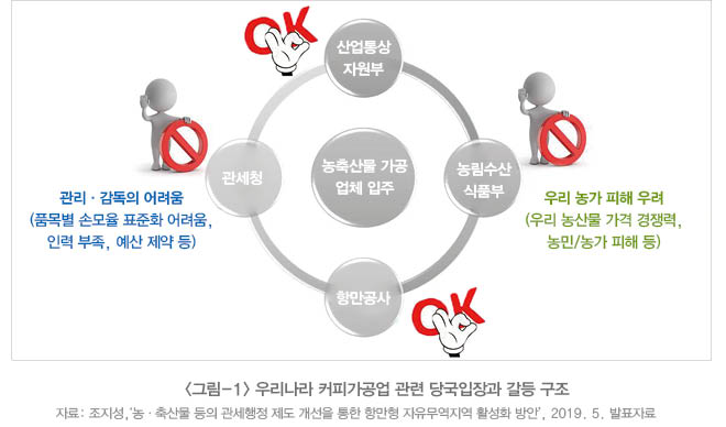 우리나라 공항만 배후에 있는 자유무역지역은 화물들이 들어오고 나가면서 관세법에 의거해 손모율이라는 기준을 적용받고 있다. 손모율이란 화물이 들어와서 다시 수출되거나 국내로 반입될 때 밀수, 탈세 등을 방지하기 위해 들어올 때와 나갈 때 동일한 중량이 유지돼야 한다는 규정에 의해 상품이 들어올 때와 나갈 때 그 차이를 지칭하는 비율이다. 커피의 예를 들면 커피 생두를 수입해 보관 후 원두로 가공해서 나갈 경우 일반적으로 6개월~1년 동안 보관하면 1~2% 중량 감소, 로스팅할 경우 12~14% 정도 중량이 감소한다. 이 경우 자유무역지역에서 수입할 때 100kg이었던 커피가 1년 후 보관, 가공 후 나갈 때 중량이 80kg 정도 밖에 안 되는 것이다. 결국 우리나라 자유무역지역 입주 기업이 이러한 비즈니스 모델을 할 경우 매번 수입 후 가공해서 수출할 때 손실분 20%에 대해 세금을 내야 하는 것이다. 그러나 사실 이 정도의 세금을 부가해도 입주하고자 하는 기업들이 있을 수 있는데 관세당국은 각 상품별 표준화된 손모율 기준을 만드는 시간, 비용 그리고 인력 부족 등으로 해당 제도 개선을 아직 못하고 있는 상황이다. 또한 농림축산식품부는 우리나라 녹차 농가들의 피해를 언급하면서 커피 가공에 대해 부정적인 의견을 개진하고 있다(<그림-1> 참고). 결국 이런 상황으로 인해서 고부가가치 창출이 가능하고 고급 일자리 창출이 가능한 커피 가공업이 우리나라에서 크게 성장하지 못하고 있는 것이다.