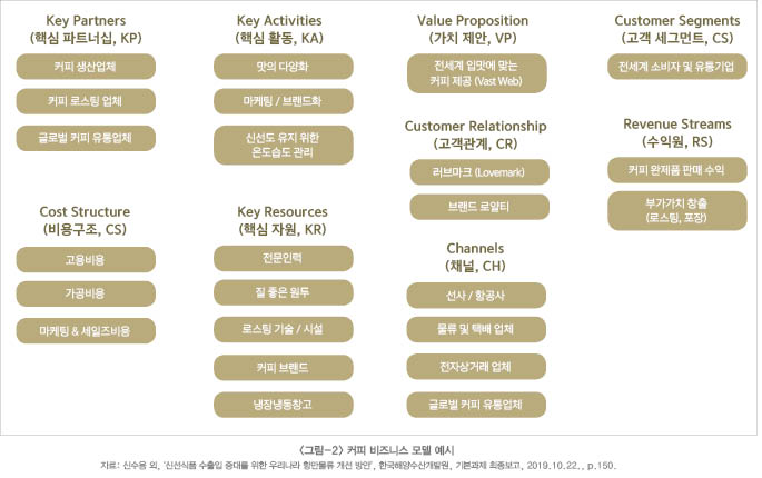 한편, 커피와 관련된 우리나라 관련 공기업, 민간기업들은 주요 원두 생산국에서 수입 후, 로스팅 및 포장을 거쳐 전 세계 소비자에게 수출할 수 있는 비즈니스 모델 개발에도 노력을 기울여야 할 시점이다. 특히 지리적으로 근접한 국가인 중국, 일본, 동남아의 경우 커피의 신선도, 맛 유지 측면에서 경쟁력을 가질 수 있을 것으로 예상된다. 이는 예를 들면 우리나라가 커피 가공허브로 전 세계시장을 대상으로 판매하겠다는 차원에서 ‘거대 확산 모델(Vast Web)’과 같은 비즈니스 모델 적용이 가능할 것이다. 해당 모델을 구현하기 위해서는 우선 양질의 원두를 생산하는 다양한 국가로부터 원두를 수입해야 한다. 그 다음 공항만 자유무역지역내 로스팅 시설, 신선도 유지를 위한 스마트 냉장·냉동 창고, 이와 관련된 기술을 보유한 숙련공을 모집해야 한다. 본 모델의 주요 수익원은 커피 완제품을 전 세계 소비자 및 유통기업에 판매한 판매 수익뿐 아니라, 로스팅, 브랜딩, 포장, 라벨링, 보관, 전시 및 도소매 등의 활동을 수행하면서 발생한 부가가치도 기대할 수 있다. 고객의 브랜드 로얄티, 러브마크 유지 및 장기적인 시장 점유율 확보를 위해서는 맛의 다양화, 브랜드화, 신선도 유지 등의 활동이 중요할 것이다.