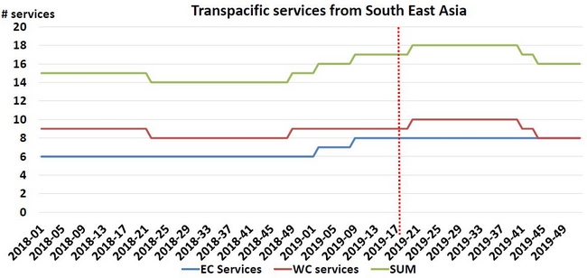 | ▲동남아-북미항로 취항 서비스 동향. 파란선은 동안행 빨간선은 서안행 초록선은 합계. / 자료: 시인텔리전스컨설팅 |