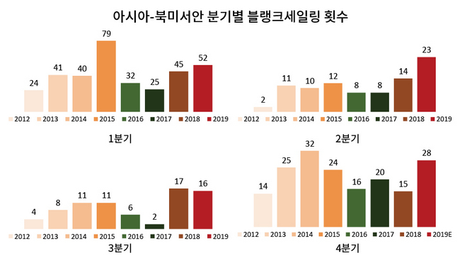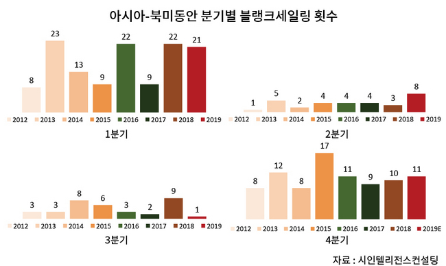 정시성이 악화된 요인에는 대규모 블랭크세일링도 한 몫 했다. 북미항로 취항선사들은 미중 무역분쟁에 대응해 아시아-북미서안에서 1분기 52회, 2분기 23회, 3분기 16회를 각각 휴항했으며, 남은 4분기에는 28회 결항할 것으로 전망된다. 지난해 임시결항 횟수는 1분기 45회, 2분기 14회, 3분기 17회, 4분기 15회를 기록해 3분기를 제외하면 대부분 10회 이상 증가했다.