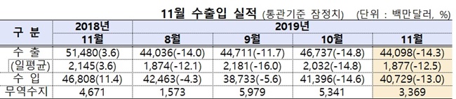 조업일수 영향을 배제한 11월 일평균 수출은 21억4500만달러를 기록, 3개월 연속 20억달러를 유지하고 있다. 11월 무역수지도 33억7000만달러로 2010년 2월 플러스 전환 이후 94개월 연속 흑자를 내고 있다.