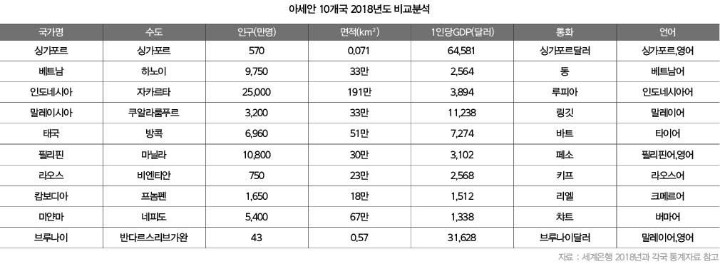 1인당 GDP규모를 보면 인구 600만명이 안되는 싱가포르는 항만과 공항 및 글로벌금융과 투자의 중심지로 6만달러 이상의 소득수준이고 5년전만 해도 4만3000달러로 소득수준이 높은 브루나이 왕국이 가스,석유 등 자원수출의 규모가 줄어 3만달러로 대폭 줄었다. 이어 말레이시아가 1만1000달러로 아세안시장에서 3위를 달리고 있는 중이다.