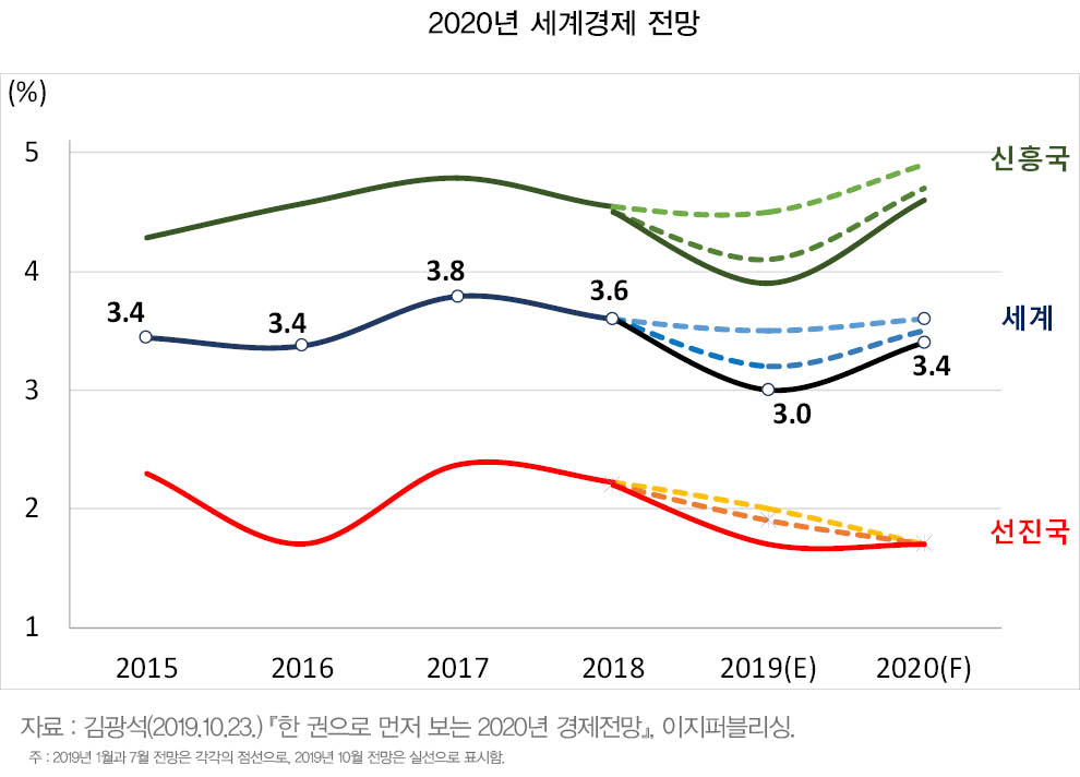 2020년 세계경제의 두드러진 특징들 중 하나는 신흥국과 선진국간이 상반된 양상에 놓일 것이라는 점이다. 미국, 유럽, 일본 등과 같은 주요 선진국 경제는 2019년에 이어 2020년에도 하락세를 지속할 것으로 보이나, 신흥국들은 2019년 저점을 기록한 이후 상당한 수준으로 반등할 것으로 예측된다. 신흥국들은 2018~2019년 동안의 위기 상황에서 벗어나는 국면이지만, 선진국들은 보호무역조치들과 브렉시트 등의 영향으로 부진한 흐름을 보일 전망이다.