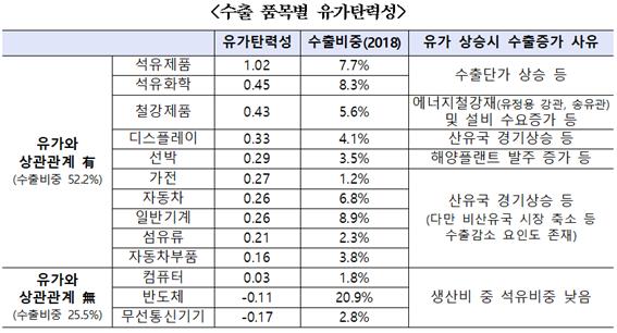협회 관계자는 “안정적인 흐름에서 10% 상승한 국제유가(두바이유)는 현 경제 상황을 고려하면 배럴당 65~70달러 정도로 예상한다”며 “국제유가가 배럴당 60~80달러 미만을 유지한다면 우리나라 주요 수출 품목 13개 중 10개 품목은 수출 시장에서 호조세를 이어갈 것”이라고 밝혔다.