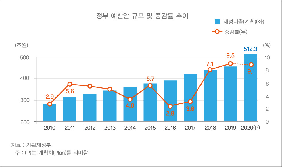 2020년 예산은 약 512.3조원에 달한다. 2019년 예산과 비교하면 42.7조원이 증액됐다. 재정지출 규모의 증감률을 계산해 보면, 2020년 9.1%로 상당히 높은 수준이다.