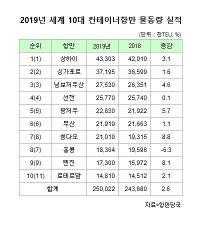 17일 부산항만공사 등 각 항만당국에 따르면 지난해 세계 10대항만의 컨테이너 물동량은 2억5002만TEU를 달성, 2018년의 2억4368TEU에 견줘 2.6% 성장했다.