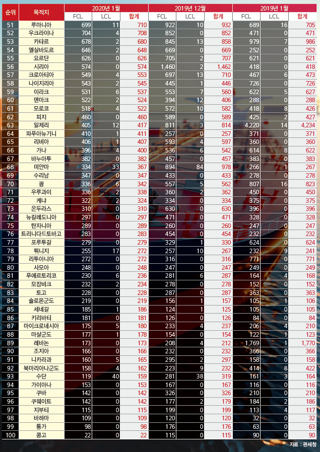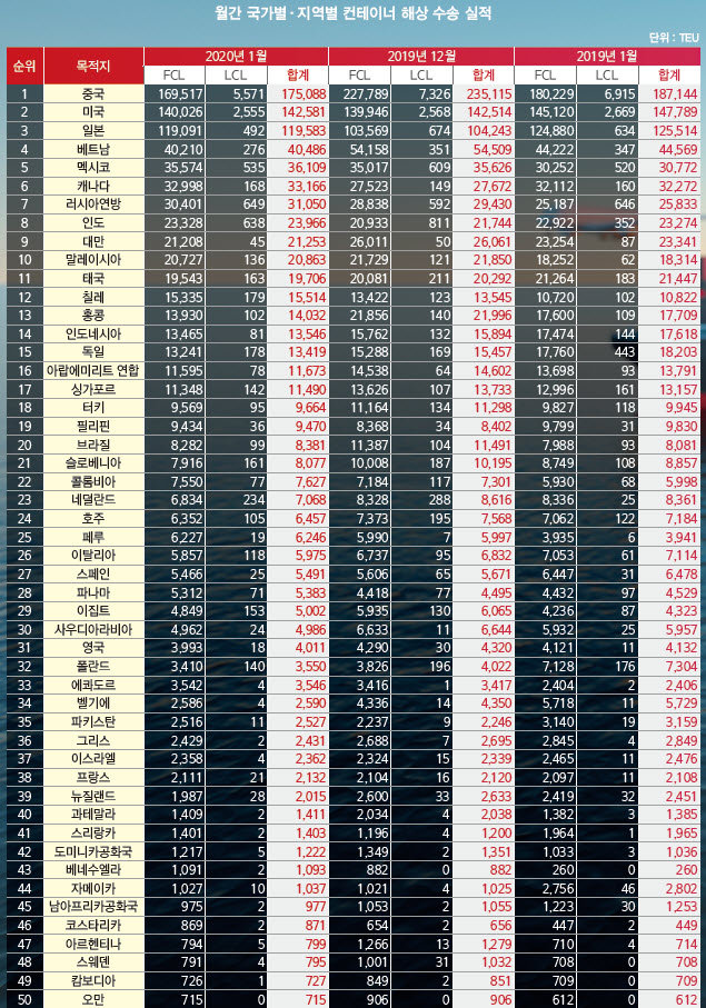 정기항로브리핑/ 월간 국가별 컨테이너 해상수출실적 (2020년 1월/전월/전년)