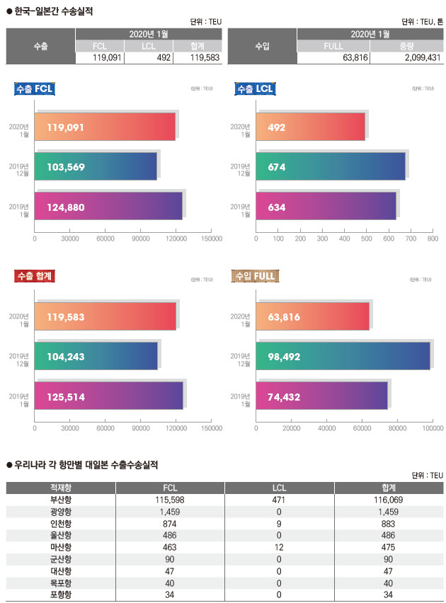 정기항로브리핑/ 한일항로 수출수송실적(2020년 1월/전월/전년)