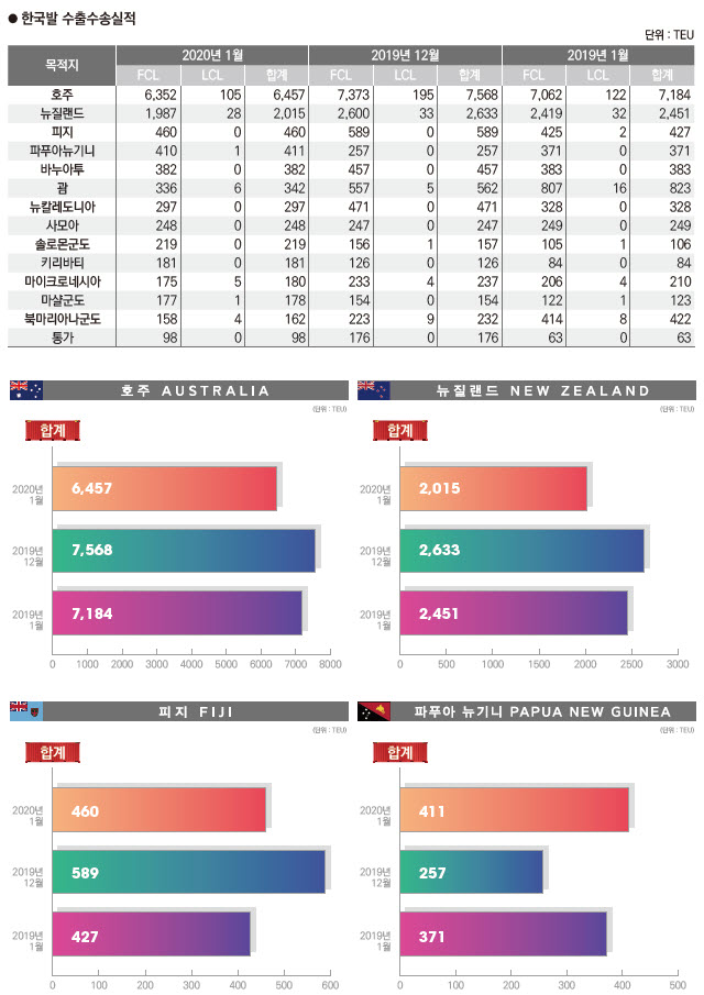 정기항로브리핑/ 호주항로 수출수송실적(2020년 1월/전월/전년)