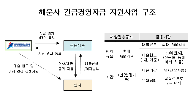 둘째 해운조합 자금을 활용해 선사에 운영자금을 지원한다. 해운조합으로부터 자금을 예탁받은 금융기관이 총 300억원 규모로 업체당 최대 10억원까지 긴급경영자금 지원을 저리 대출한다. 조합에선 자체 운영 중인 사업자금 중 20억원을 활용해 피해 중소 조합원을 대상으로 업체당 최대 1억원 규모로 대부서비스를 지원한다.
