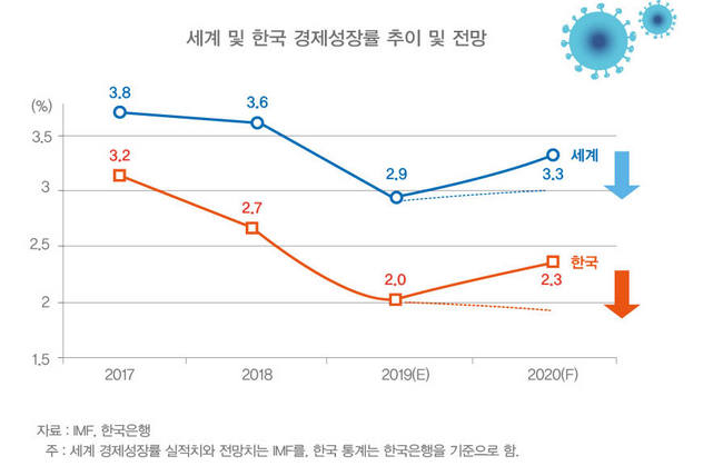 세계 경제에 커다란 물음표가 던져 졌다. 1월 말 본격적으로 코로나-19이 확산되면서 양상이 달라졌다. IMF는 코로나-19이 ‘세계 경제의 새로운 리스크 요인이 될 수 있음’을 경고했다. 한국은행과 KDI는 한국 경제에 미치는 영향이 불가피할 것으로 진단했다. 국내 주요 연구기관들은 코로나-19의 경제적 영향으로 경제적 충격을 추산했고, 평균적으로 0.1~0.2%p의 하방압력이 작용할 것으로 분석했다. 한국 경제는 2019년 2.0%의 경제성장률을 기록한 이후, 2020년 2.2% 수준의 완만한 회복을 기대하는 시점에서 찬물이 끼얹어진 모습이다. 2020년에도 2019년의 어려운 경제에서 벗어나지 못하는 ‘더블 딥(double deep)’ 가능성이 고조되는 상황이다. 코로나-19이 가져올 경제적 영향과 시나리오를 진단하고, 대응책을 마련하는 것이 시급한 상황이다.