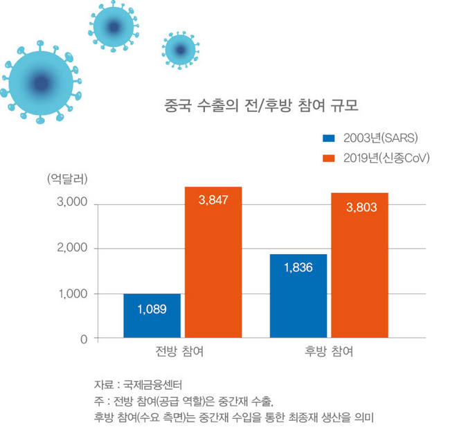 셋째, 글로벌 공급망(GVC, Global Value Chain)에 차질을 피해가기 어렵다. 중국은 ‘세계의 공장’이라는 수식어에 걸맞게, 글로벌 공급망에서 막대한 영향력을 행사하고 있다. 그리고 그 규모는 2003년 사스 사태와는 비교도 안 될 만큼 증대됐다. 중국에서 생산하는 중간재 공급에 차질이 생김에 따라 이를 최종재 생산에 사용하는 국가 경제에도 영향이 있는 것이다. 한국은 중국산 중간재를 수입하는 1위 교역국이다. 중국 내 바이러스 전이가 심각한 지역들을 중심으로 공장 가동이 멈춤에 따라, 한국의 완제품 생산에 발목이 잡히게 됐다. 다행히, 바이러스 피해가 약한 연해지역을 중심으로 한 공장들이 재가동에 들어가 한국 제조업에 차질이 완화되고는 있으나, 그 피해와 전이 여부에 따라 어떻게 전개될지는 지켜보아야 할 일이다. 중국 현지 기업이나 국내 기업의 중국 공장 가동 여부가 관건일 것이다.