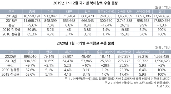 지난 한 해 북미항로에선 미·중 무역분쟁 여파로 중국과 동남아시아의 희비가 엇갈렸다. 중국의 북미수출 점유율은 급격한 하강 국면으로 접어든 반면, 대체지로 급부상한 동남아시아국가연합(아세안)은 가파른 물동량 상승세를 기록했다.