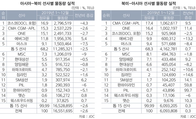 OOCL 인수 효과에 힘입어 세계 1위로 올라선 중국 코스코는 전년 대비 4.3% 감소한 279만6500TEU의 컨테이너를 아시아에서 북미로 실어날랐다. 코스코에 밀려 2위로 내려앉은 프랑스 CMA-CGM의 수송량은 1년 전보다 2.6% 후퇴한 253만7200TEU에 그쳤다.
