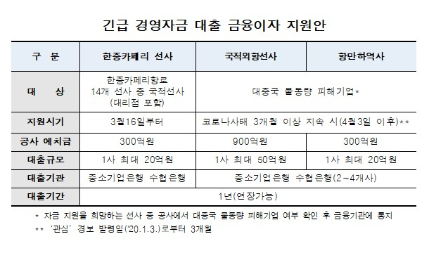 우선 한중카페리선사 국적외항선사 항만하역사에 1500억원 규모의 긴급 경영자금이 지원된다. 공사가 해당 자금을 금융기관에 예치하고 금융기관은 심사를 통해 선사에 긴급 운전자금으로 대출하는 방식이다. 예치한 자금에서 발생하는 이자수입을 선사의 대출 금리를 감면하는 데 활용한다. 공사는 중소기업은행 수협은행과 긴급 경영자금 대출 협약을 체결했다.