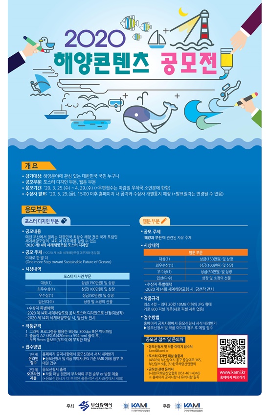 한국해양산업협회(KAMI)는 25일 ‘제1회 해양 콘텐츠 공모전’을 개최한다고 밝혔다. 공모는 해양 웹튠과 포스터 두 개 분야로 진행되며, 오는 4월29일까지 한 달 동안 접수를 받는다.