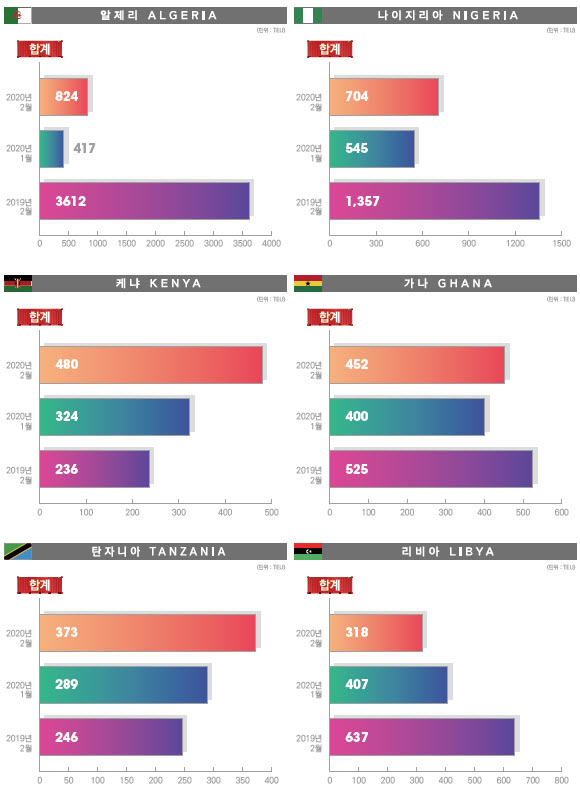 정기항로브리핑/ 아프리카항로 수출수송실적(2020년 2월/전월/전년)