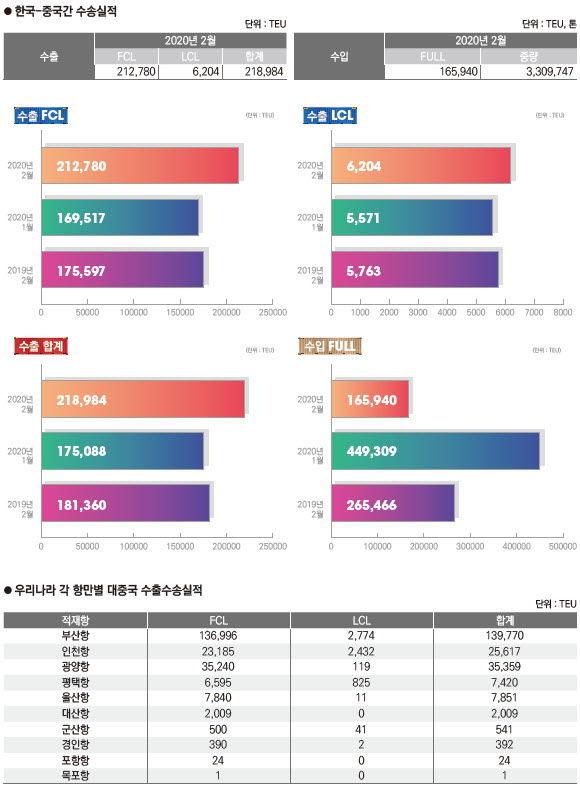 정기항로브리핑/ 한중항로 수출수송실적(2020년 2월/전월/전년)