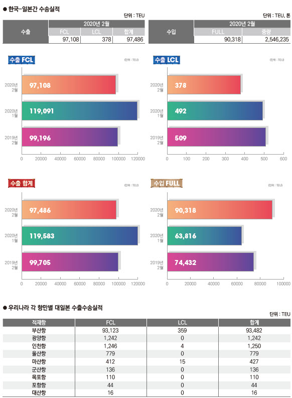 정기항로브리핑/ 한일항로 수출수송실적(2020년 2월/전월/전년)