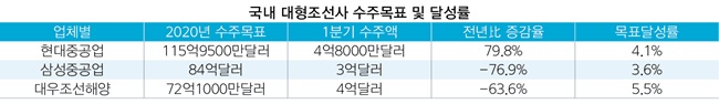 올해 1분기(1~3월) 국내 조선시장은 신종 코로나바이러스 감염증(코로나19) 후폭풍으로 꽁꽁 얼어붙었다. 코로나 사태 장기화로 글로벌 불확실성이 가중되면서 선주들이 발주를 연기한 탓에 조선사들의 수주실적은 크게 악화된 것으로 나타났다.