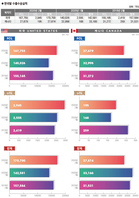 정기항로브리핑/ 북미항로 수출수송실적(2020년 2월/전월/전년)