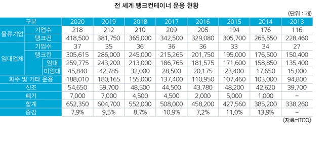 국제탱크컨테이너기구(ITCO)에 따르면 올해 1월1일 현재 세계 탱크컨테이너 개수는 65만2350개를 기록, 지난해의 60만4700개보다 8% 증가했다. 통계를 집계하기 시작한 1992년의 6만7000개에 견줘 9배 이상 성장하며 사상 최대치를 경신했다.