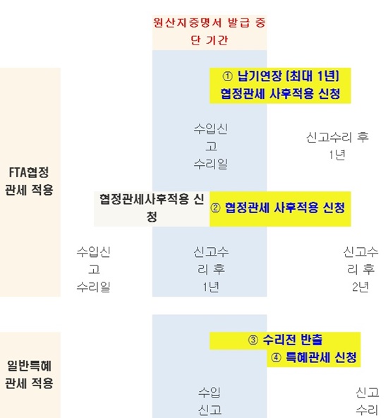 먼저 관세청은 FTA 상대국의 원산지증명서를 발급받지 못한 기업에 수입통관 시 관세 등의 납부기한을 최대 1년까지 연장해준다. 관세 등 납부에 따른 자금부담 없이 우선 통관할 수 있도록 한 뒤 원산지증명서 발급이 재개될 때 협정관세를 적용할 수 있도록 한 것이다.