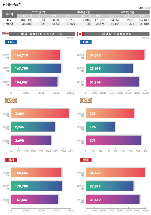 정기항로브리핑/ 북미항로 수출수송실적(2020년 3월/전월/전년)