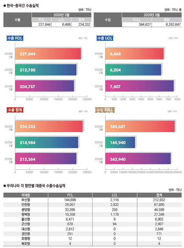 정기항로브리핑/ 한중항로 수출수송실적(2020년 3월/전월/전년)