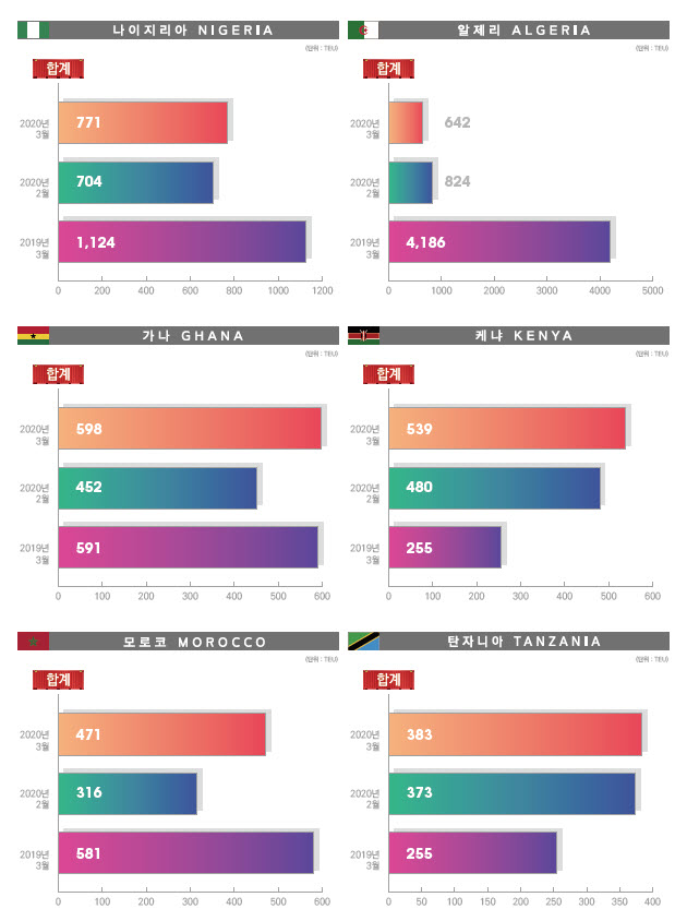 정기항로브리핑/ 아프리카항로 수출수송실적(2020년 3월/전월/전년)
