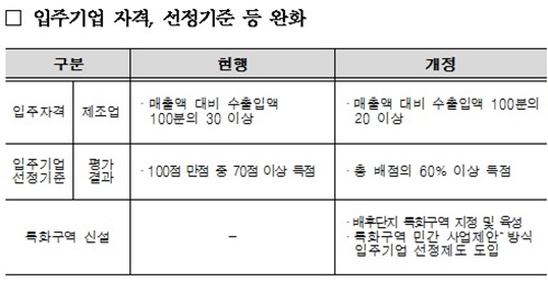 먼저 부가가치 및 일자리 창출 효과가 높은 제조·가공 기능을 갖춘 복합물류기업 유치를 확대하기 위해 제조업종 입주자격 중 매출액 대비 수출입액 비중을 30% 이상에서 20% 이상으로 크게 낮추고 입주기업 선정기준은 현행 사업계획서 평가 70점 이상에서 60점 이상으로 하향 조정했다.