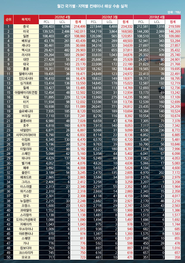 정기항로브리핑/ 월간 국가별 컨테이너 해상수출실적 1~50위 (2020년 4월/전월/전년)