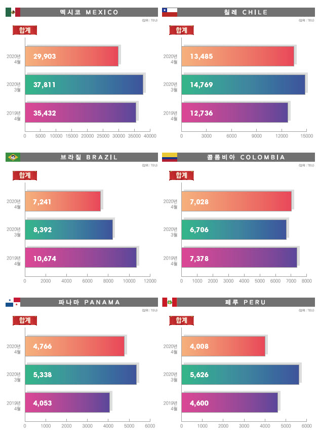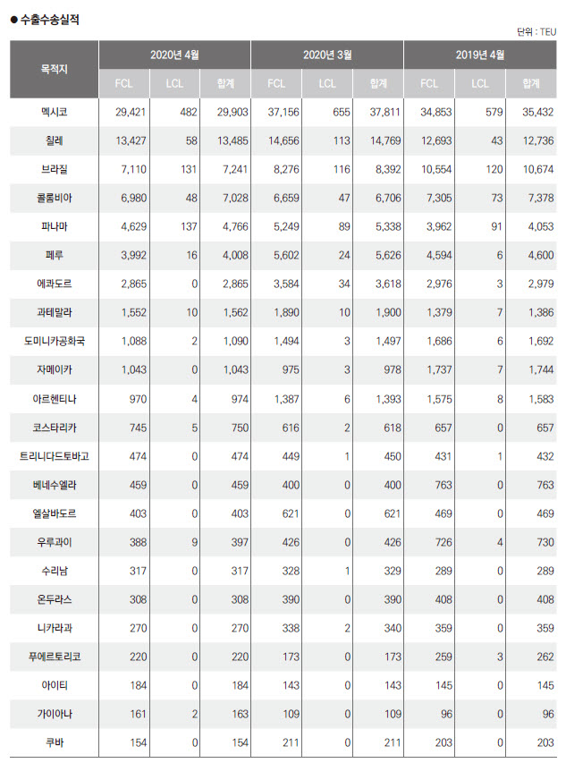 정기항로브리핑/ 중남미항로 수출수송실적(2020년4월/전월/전년)