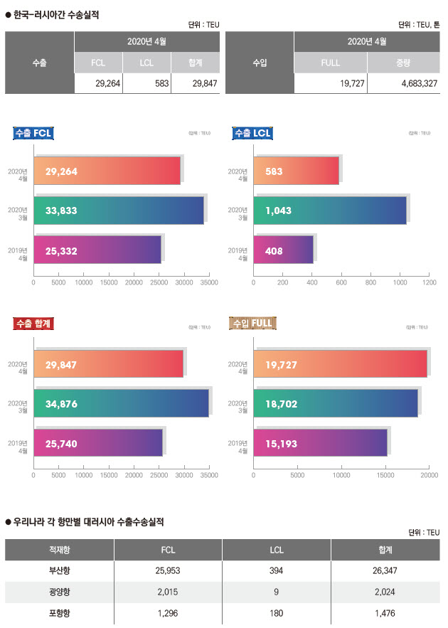 정기항로브리핑/ 한러항로 수출수송실적(2020년 4월/전월/전년)